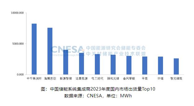 2023年,國內市場中,儲能系統出貨量排名前十的中國企業,依次為:中車株洲所、海博思創、新源智儲、遠景能源、電工時代、融和元儲、金風零碳、平高、許繼和智光儲能。