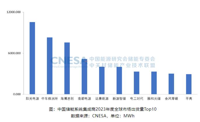 2023年,全球市場中,儲能系統出貨量排名前十的中國企業,依次為:陽光電源、中車株洲所、海博思創、南都電源、遠景能源、新源智儲、電工時代、融和元儲、金風零碳和平高。