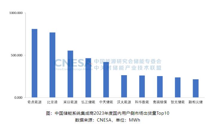 2023年,國內用戶側市場中,儲能系統出貨量排名前十的中國企業,依次為:奇點能源、比亞迪、采日能源、弘正儲能、中天儲能、沃太能源、科華數能、南瑞繼保、智光儲能和融和元儲。