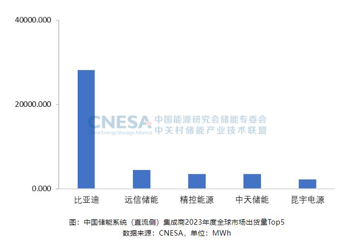 2023年,全球市場中,儲能系統(直流側)出貨量排名前五位的中國企業,依次為:比亞迪、遠信儲能、精控能源、中天儲能和昆宇電源。