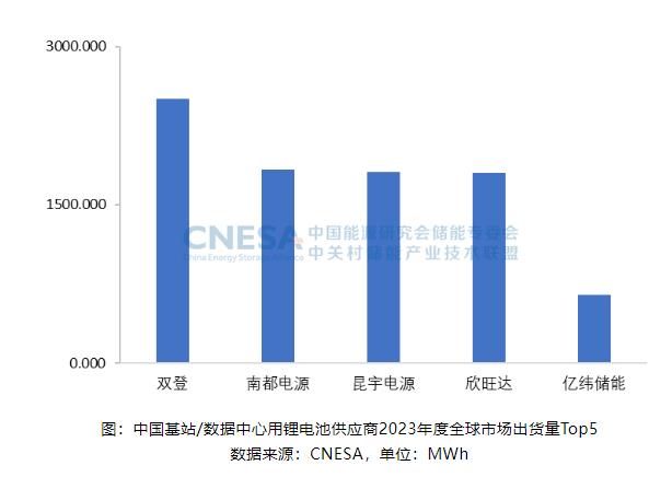 2023年,全球市場中,基站/數據中心用鋰電池出貨量排名前五位的中國企業,依次為:雙登、南都電源、昆宇電源、欣旺達和億緯儲能。