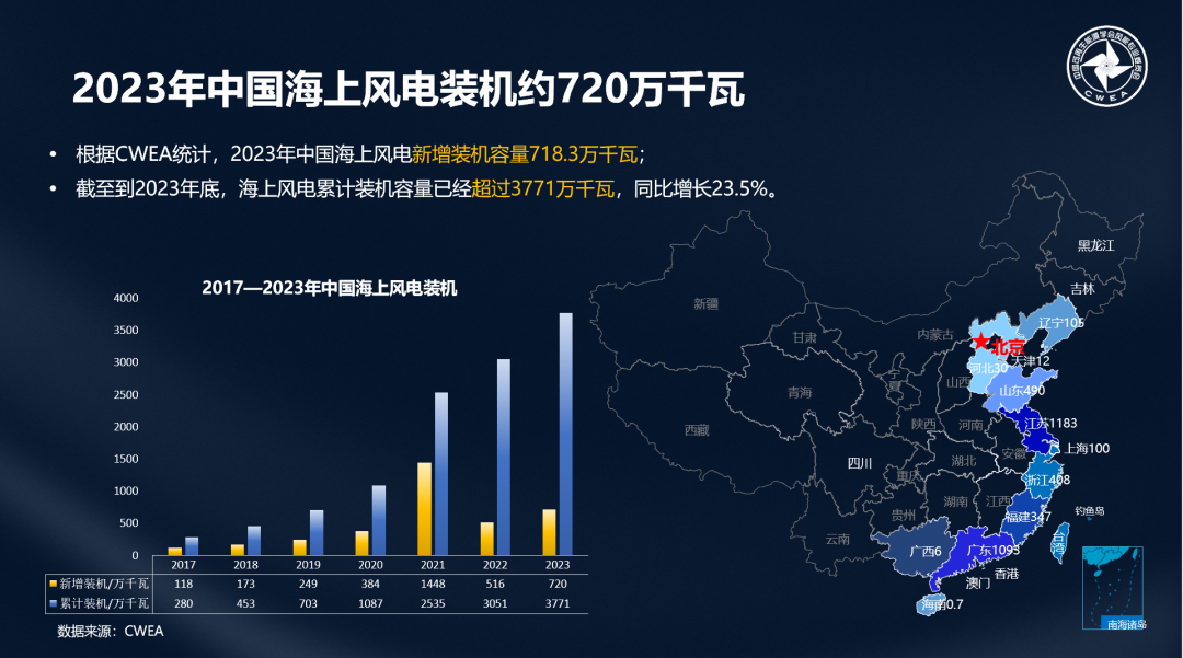 “十四五”前期,我國實現了海上風電穩步發展,CWEA數據顯示,2023年度海上風電新增裝機容量718.3萬千瓦,累計裝機容量已經超過3771萬千瓦,同比增長23.5%。