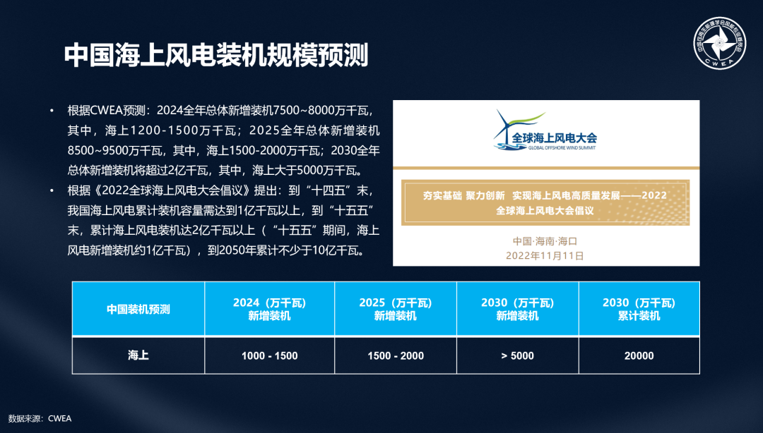 CWEA研究顯示,海上風電規劃發展潛力巨大,“十四五”期間,中國沿海地區海上風電規劃容量約5500萬千瓦。預計2024全年總體新增裝機7500~8000萬千瓦,其中,海上1200-1500萬千瓦;2025全年總體新增裝機8500~9500萬千瓦,其中,海上1500-2000萬千瓦;2030全年總體新增裝機將超過2億千瓦,其中,海上大于5000萬千瓦。