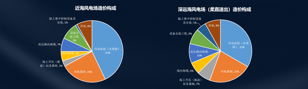 上圖可以看出,近海風電場風電機組在總投資中占比最高,隨著海上風電向深遠海開發,設備投資占比逐步降低,風機基礎等建筑工程占比逐步提升;在漂浮式風電場中主要設備占比已低于風機基礎。另外,在深遠海風電場采用柔性直流輸電后,海上及陸上換流站、高壓海纜路由的占比明顯提高。其中,占比較大的機組價格下降幅度較大,2024年5月,華能半島北L場址海上風電項目,單機12-14MW,含塔筒的折合單價已經到了3000元左右每千瓦左右的價格。
